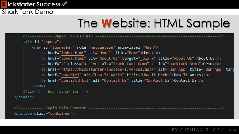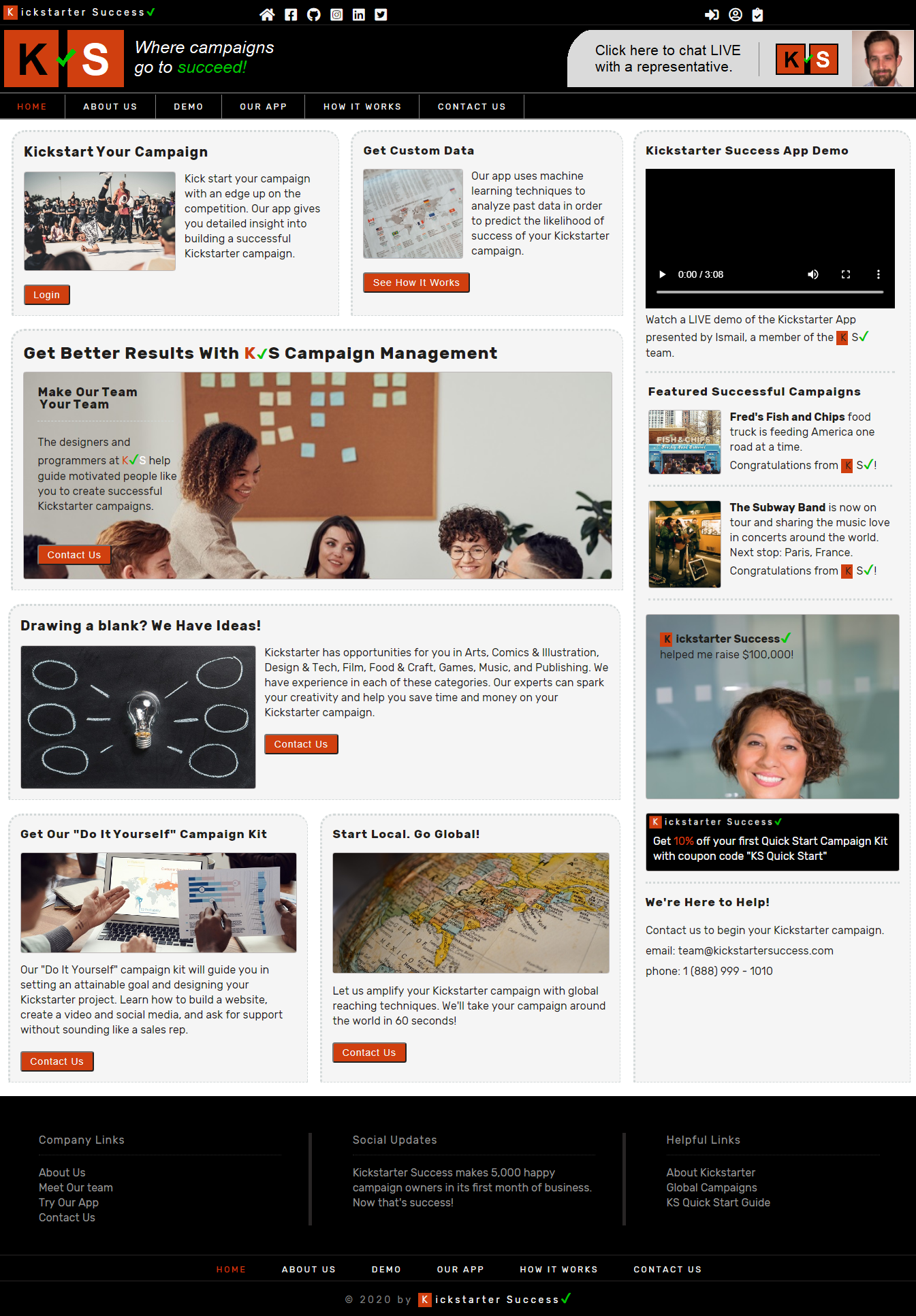 Predictions vary based on campaign category, fundraising goal, description, and length in terms of how many days the campaign will run. Now, since the other team members will tell you more about what goes on behind the scenes of the app, we are going to explore the KS✔ website.
